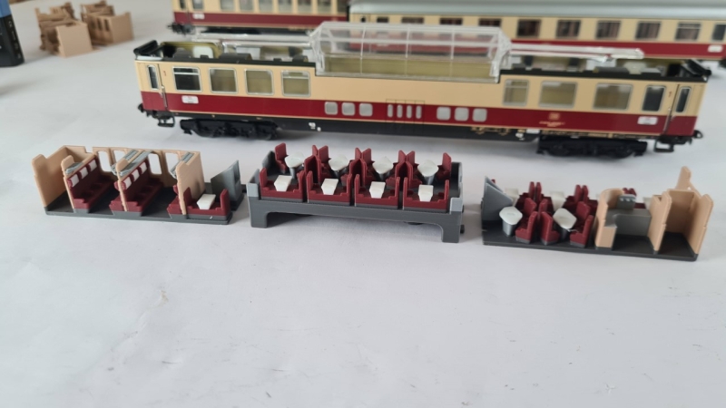 1 Stück Inneneinrichtung mit 1 Mittelstücken Variante 1 (Sessel mit Tischen und Lämpchen in der Aussichtsplattform) für TEE Aussichtswagen Märklin 4090 mit 20 Stück Tischlämpchen (15+5 Ersatz)