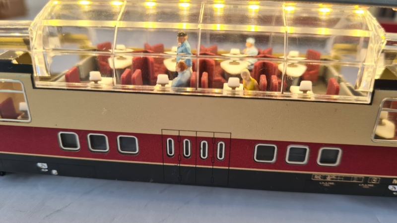 Bei diesem Wagen ist es notwendig, dass Sie vorher die Original-Inneneinrichtung entfernen. Die Originalbeleuchtung von Märklin ist am besten geeignet, da der Lichtkörper hierfür bereits an der Kuppel mit enthalten ist. Hier bauen Sie am besten warmweisse LED-Birnen ein.