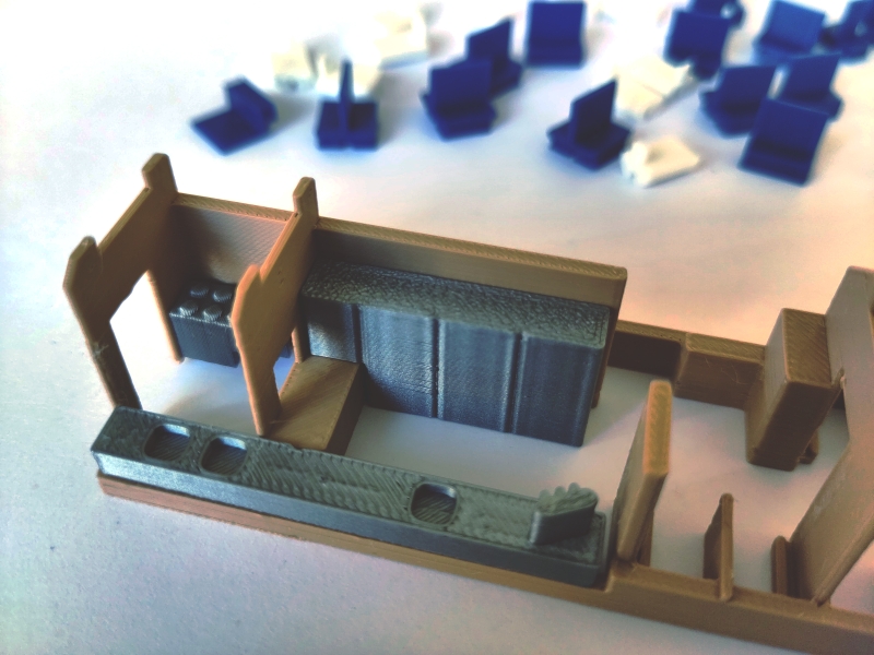 - Auf die gleiche Weise stecken Sie nun die Tische auf die verbliebenen (= höheren) Stege auf. Am einfachsten ist es, die Tische zum Rahmenende hin zu platzieren und gegen Gangmitte vorsichtig herunterdrücken. Drücken Sie niemals auf / an die Tischlampen, da diese leicht abbrechen können.
