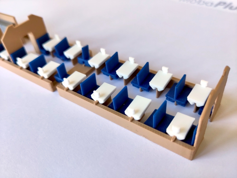 - Legen Sie die Einrichtung auf den Wagenboden. Die Speiseraum zeigt in Richtung Einstiegsplattform, die Küche zum anderen Wagenende.