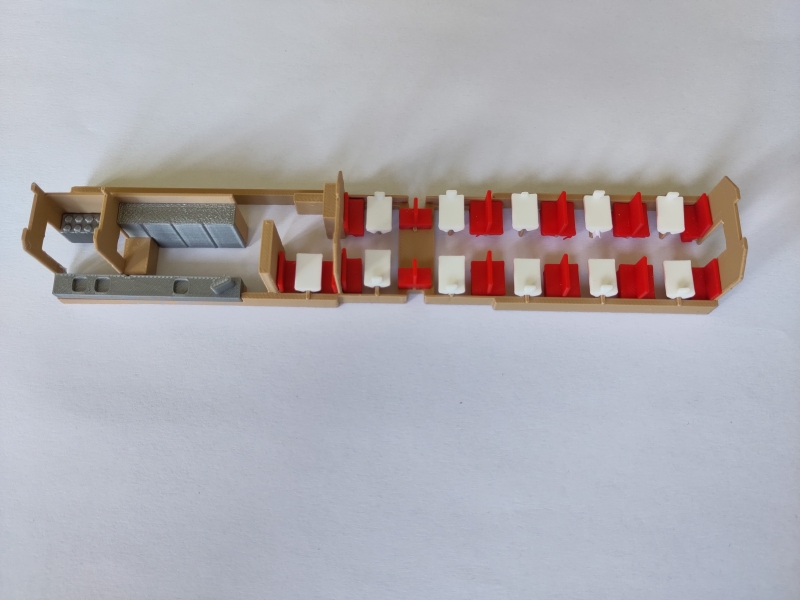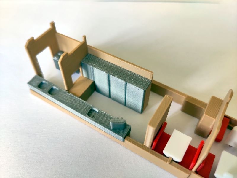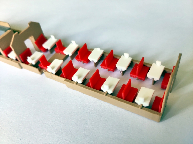 - Legen Sie die Einrichtung auf den Wagenboden. Die Speiseraum zeigt in Richtung Einstiegsplattform, die Küche zum anderen Wagenende.
