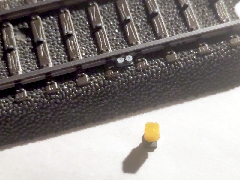 Der Achszähler ist für die Verwendung mit dem C-Gleis optimiert, d.h. er kann ohne Leim zwischen die Schwellen von aussen in das Gleis eingesteckt werden. Auch hier ist ein viel Feingefühl nötig, denn der Fuss zum Einschieben unter das C-Gleis hat bloss etwa 0.3mm, der ganze Achszähler misst auch bloss 2x4 mm. Verwenden Sie auch hier eine Pinzette!